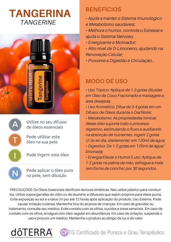 - Quando necessário, use o óleo essencial de Tangerina e transporte em si um aroma revigorante e fresco ao longo do dia.